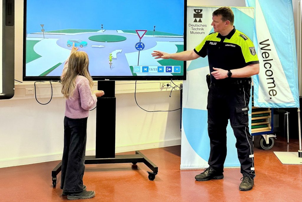 Im Dezember ging es für die 4. Klassen an einen ganz besonderen Ort für die Verkehrsschule. Mitten im Spektrum Museum haben wir uns mit unserem Verkehrspolizisten getroffen, wo er mit den Kindern die Vorfahrtsregeln besprochen hat. Ampel, Verkehrspolizist, Verkehrsschilder, Rechts vor Links – Damit es jeder versteht, wird der Seminarraum zur imaginären Kreuzung. Eigentlich trafen wir uns dort, um uns auch noch die Ausstellung Rückenwind anzuschauen und die ganzen interaktiven Ausstellungen zu test. Pech gehabt – auch hier wird gestreikt und die Ausstellung ist zu – alle anderen Klassen hatten mehr Glück. Extra für die 4c wurde der Weg zum Seminarraum geöffnet und dank des lieben Schließdienstes durften wir nach dem Unterricht mit der Polizei wenigstens kurz die eigentlich geschlossene Ausstellung begehen.